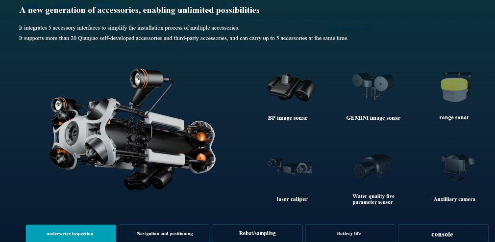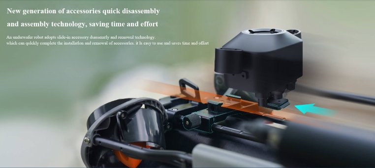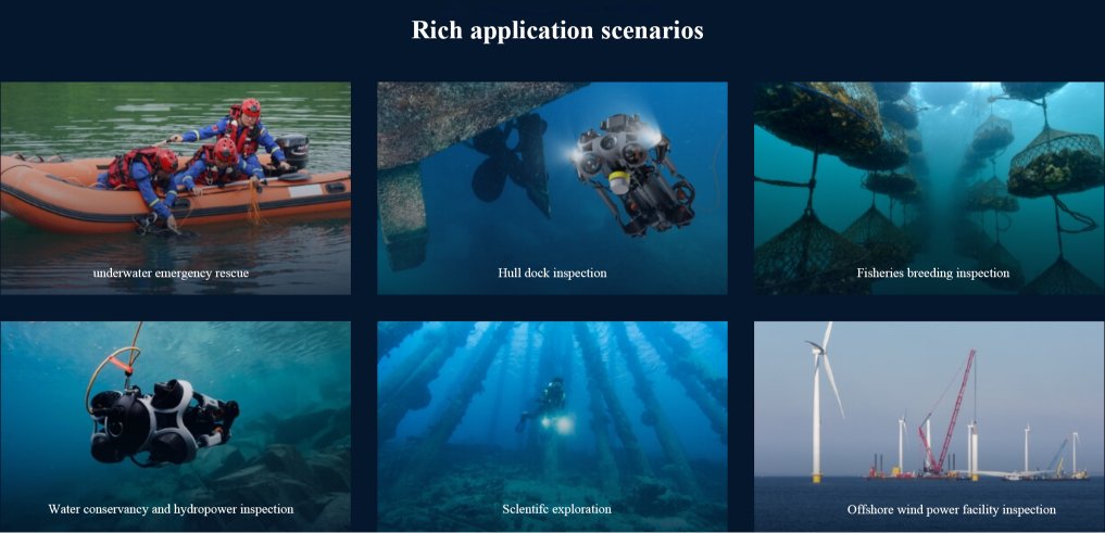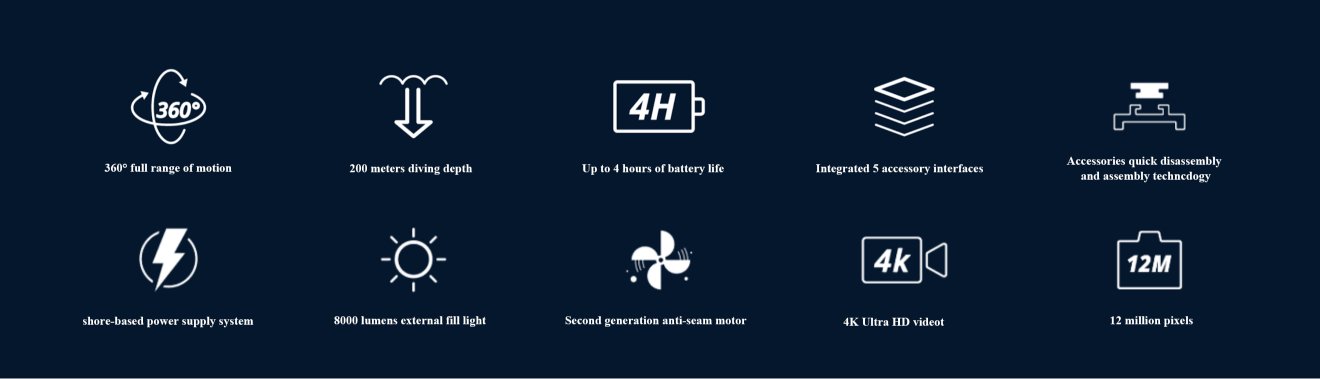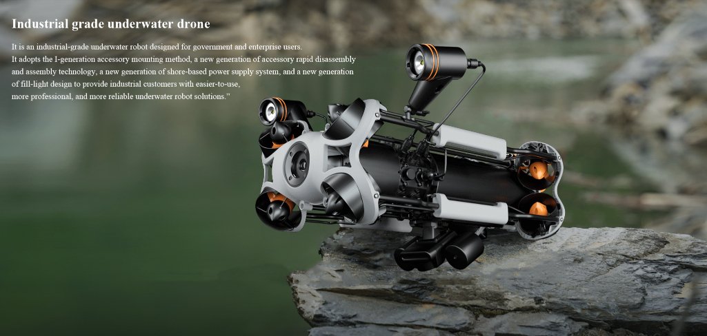 This is an industrial-grade underwater robot designed for government and enterprise users. It adopts a new generation of accessory mounting method, a new generation of accessory rapid disassembly and assembly technology, a new generation of shore-based power supply system and a new generation of fill light design to provide industry customers with easier-to-use, more professional and more reliable underwater robot solutions.