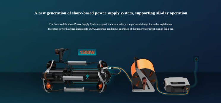 The Submersible Shore Power Supply System (C-SPSS) adopts a battery compartment design, which is easier to install. The output power is increased to 1500W to ensure full power of the underwater robot. It can work continuously without power outage during operation.