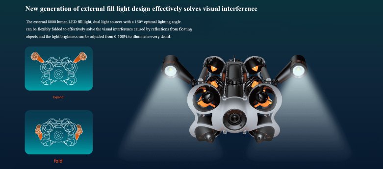 The external 8000 lumen LED fill light, dual light sources with a 150° optimal lighting angle, can be flexibly folded to effectively solve the visual interference caused by reflections from floating objects, and the light brightness can be adjusted from 0-100% to illuminate every detail.