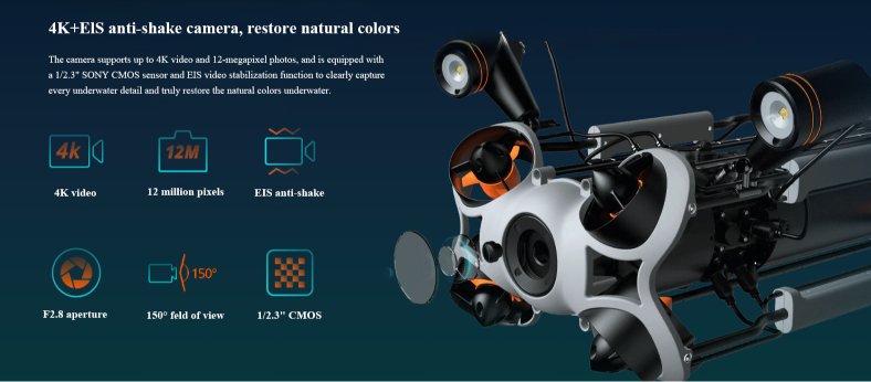 Its camera supports up to 4K video and 12-megapixel photos, and is equipped with a 1/2.3″ SONY CMOS and EIS video stabilization function to clearly capture every underwater detail and truly restore the natural colors underwater.