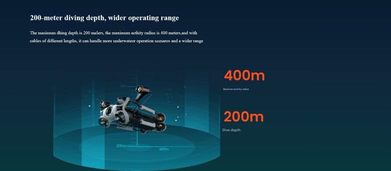 It can dive up to 200 meters, making it ideal for deep-sea operations, infrastructure inspections, and scientific exploration.