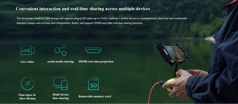 It has a built-in 128G pluggable SD memory card (supports up to 512G), supports 3 mobile devices to share real-time underwater images and real-time data (temperature, depth) at the same time, supports HDMI real-time screen projection and live broadcast Real-time sharing function.