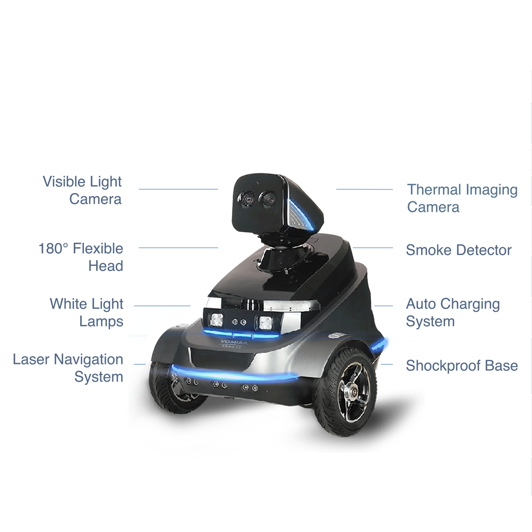 It features a 12,800 mAh battery with up to 10 hours of operation. Auto-charging ensures minimal downtime, making it reliable for day-and-night building surveillance and patrol.